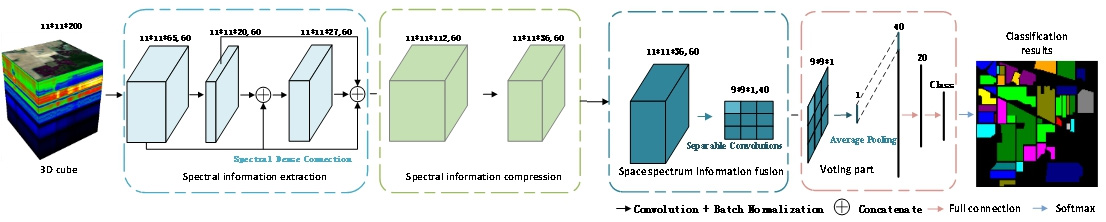 我们以Indian PinesPavia UniversityKennedy Space Center等公开数据集为研究对象,开发了面向高光谱地物分类的OBT模型。该模型借鉴了密集连接(DenseBlock)网络的思想,每一层的输出作为输入连接到后面所有的卷积层,同时这种方法也不需要学习冗余的特征图,减少了参数量。